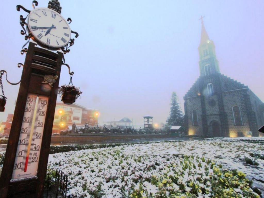 - SÃO JOAQUIM (SC) – Conhecida como a cidade da Maçã, a pequena São Joaquim certamente é uma das mais frias do Brasil, e no inverno aumenta ainda mais as chances de nevar pois sua temperatura pode chegar a 10 graus negativos. Durante o ano, o clima é ameno e uma ótima época para uma visita é no mês de Abril pois é época de colheita.